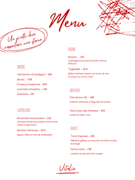 La cuisine, généreuse et raffinée, célèbre les classiques italiens revisités : pâtes fraîches aux truffes, risottos onctueux et plats signature de son chef, Matteo Vitalli. La